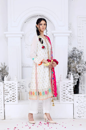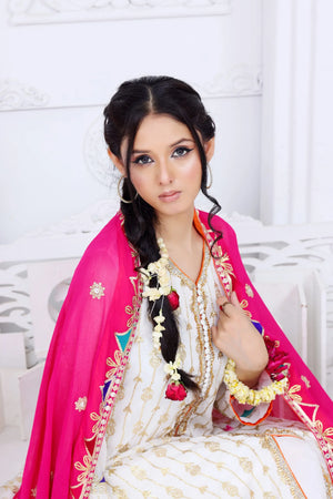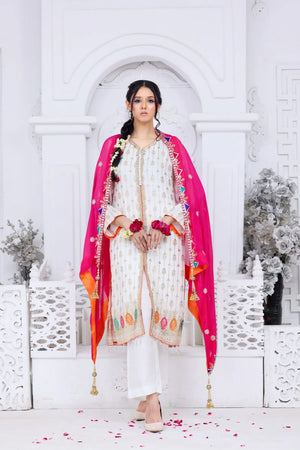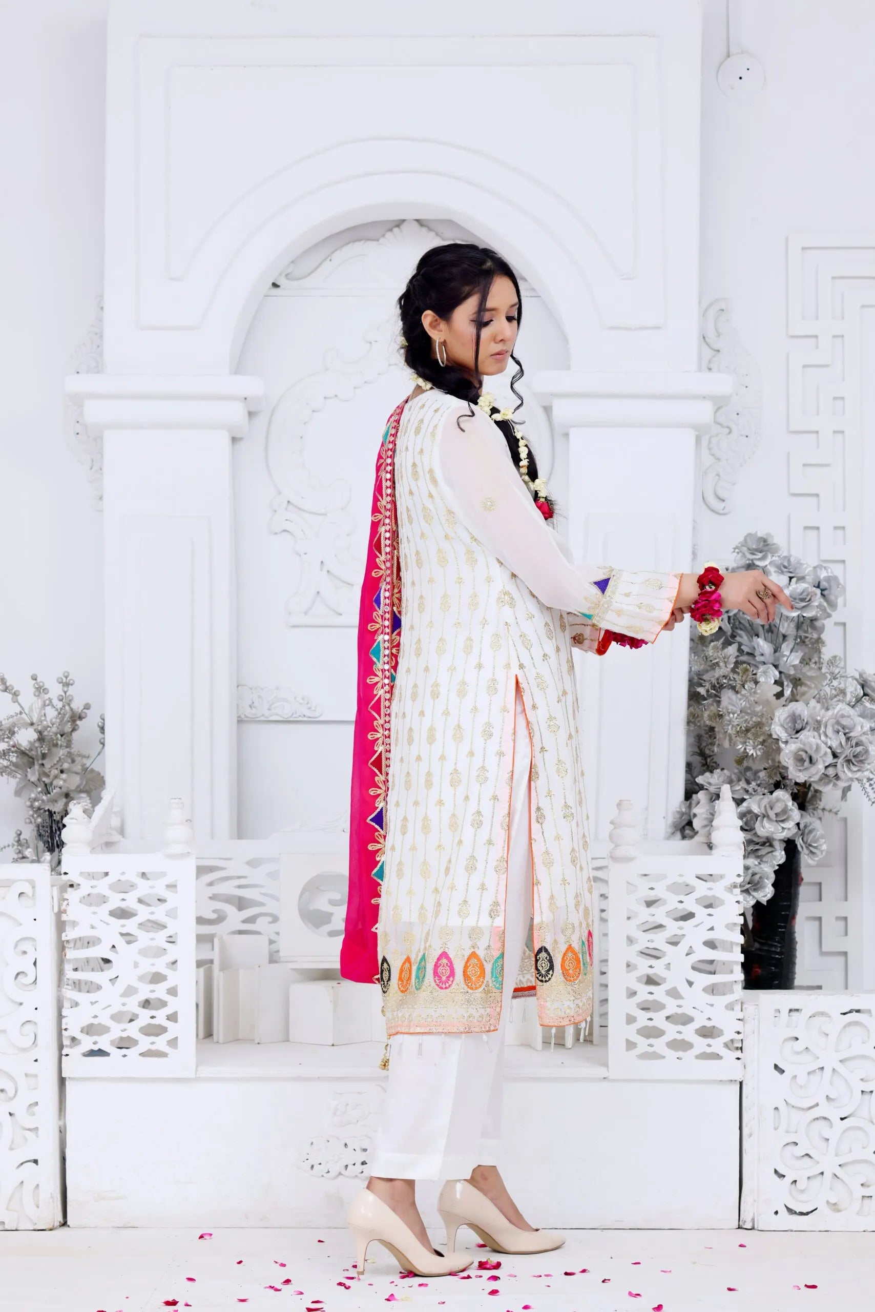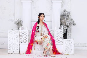 Introducing our Ivory & Fuchsia Embroidered Chiffon Dress, a stunning 3-piece outfit that blends elegance with vibrant artistry. This beautifully crafted ensemble is designed to make a bold statement at festive occasions, featuring delicate sequin embroidery and intricate threadwork for timeless charm.