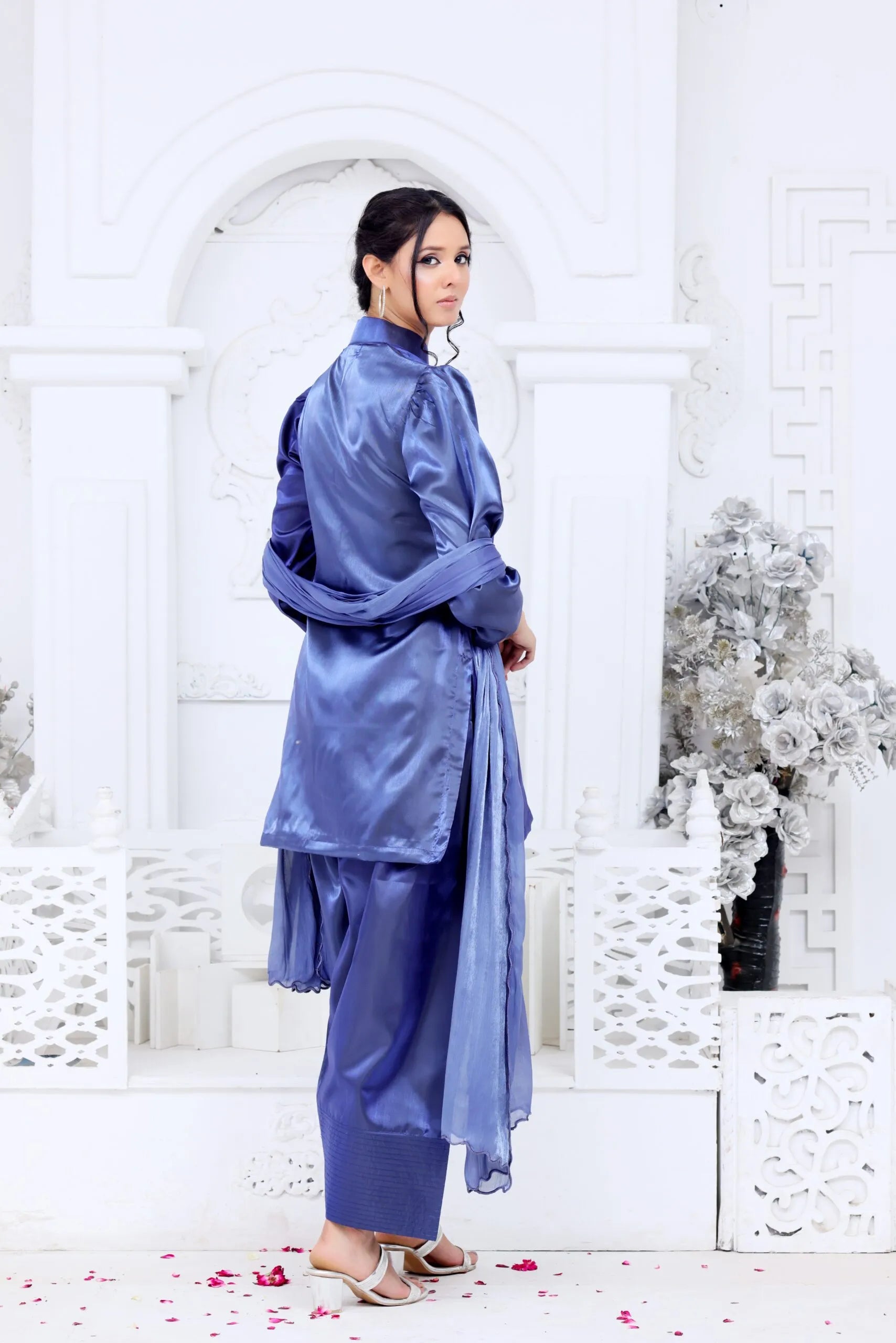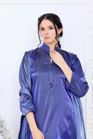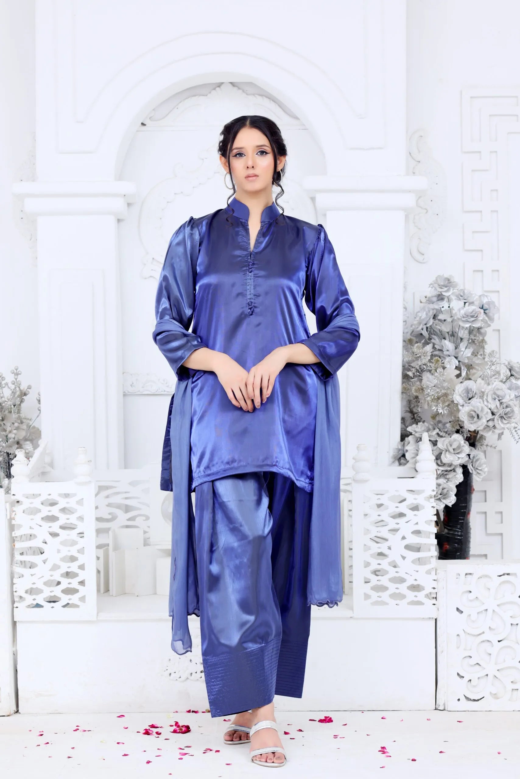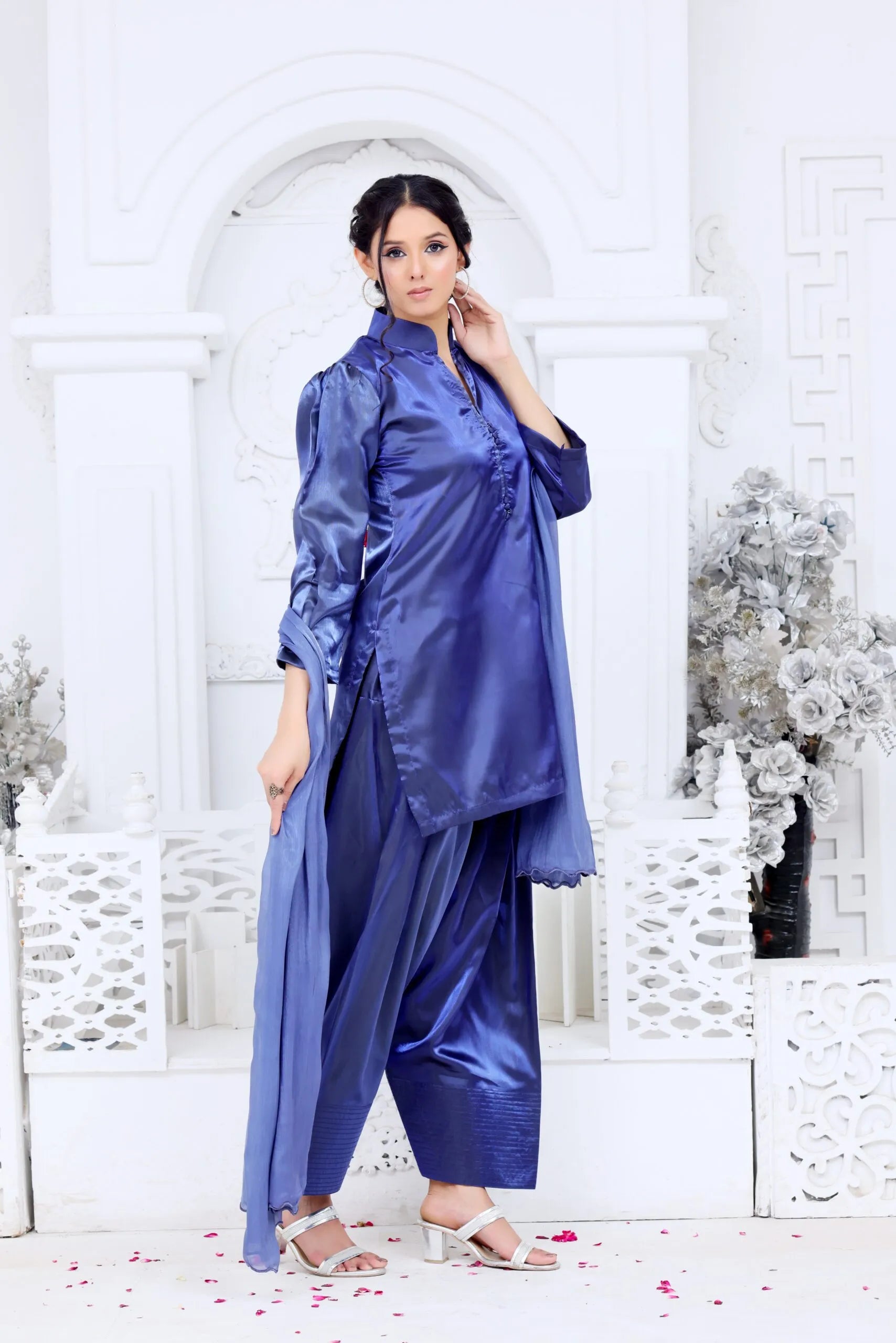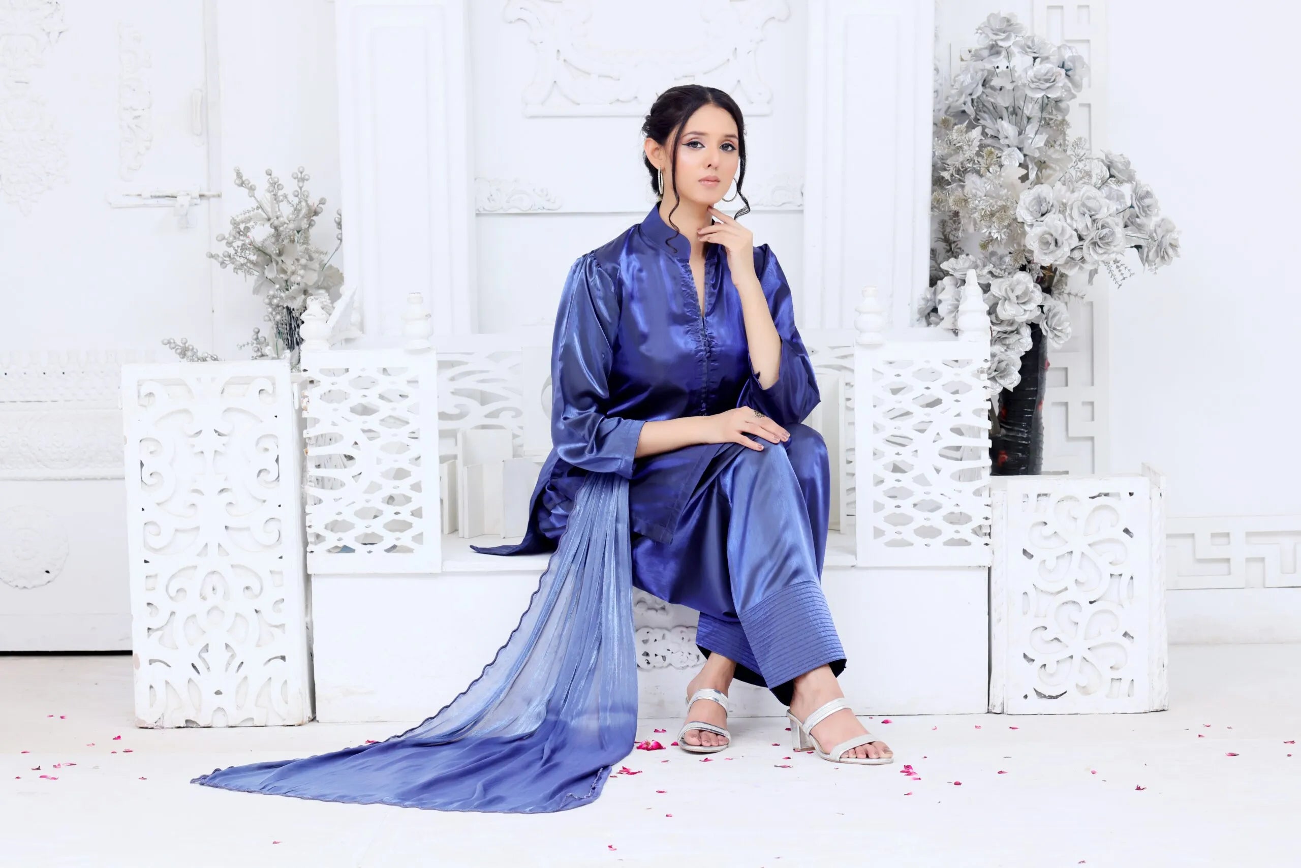 Elegance meets tradition in this 3-piece navy blue Shisha Silk ensemble featuring: