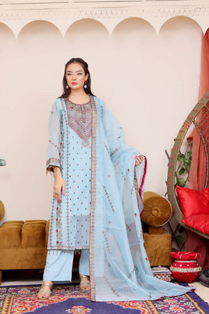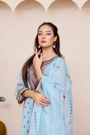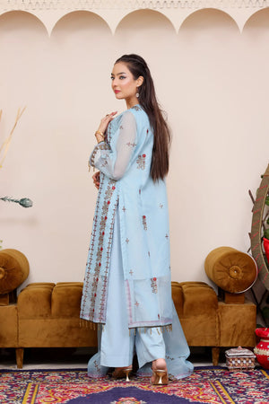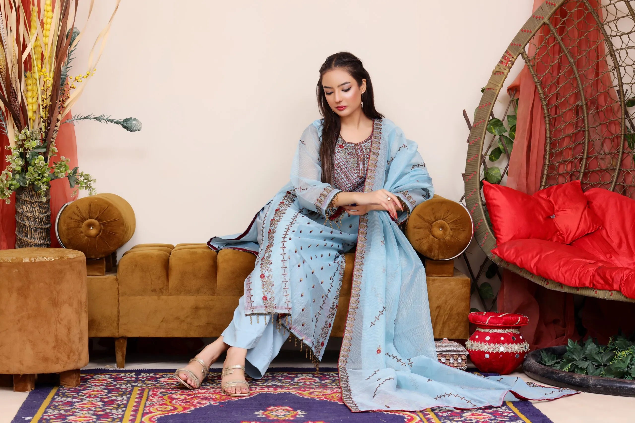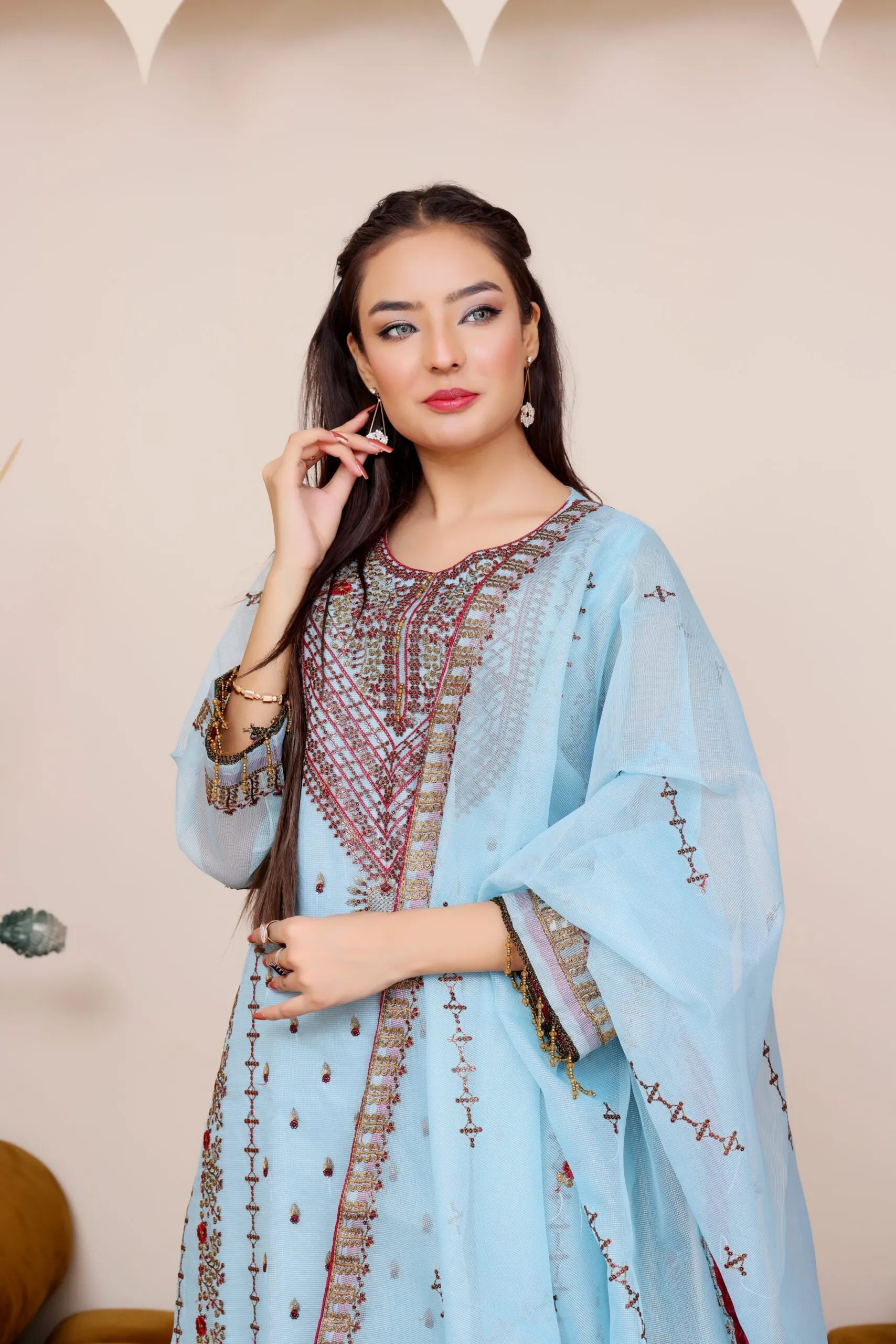Khushdil Light Blue Embroidered Dress 3-Piece Pakistani Dress – Malai Trousers & Embroidered