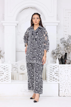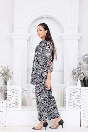The black & white shirt and trouser are both adorned with delicate cutwork crochet