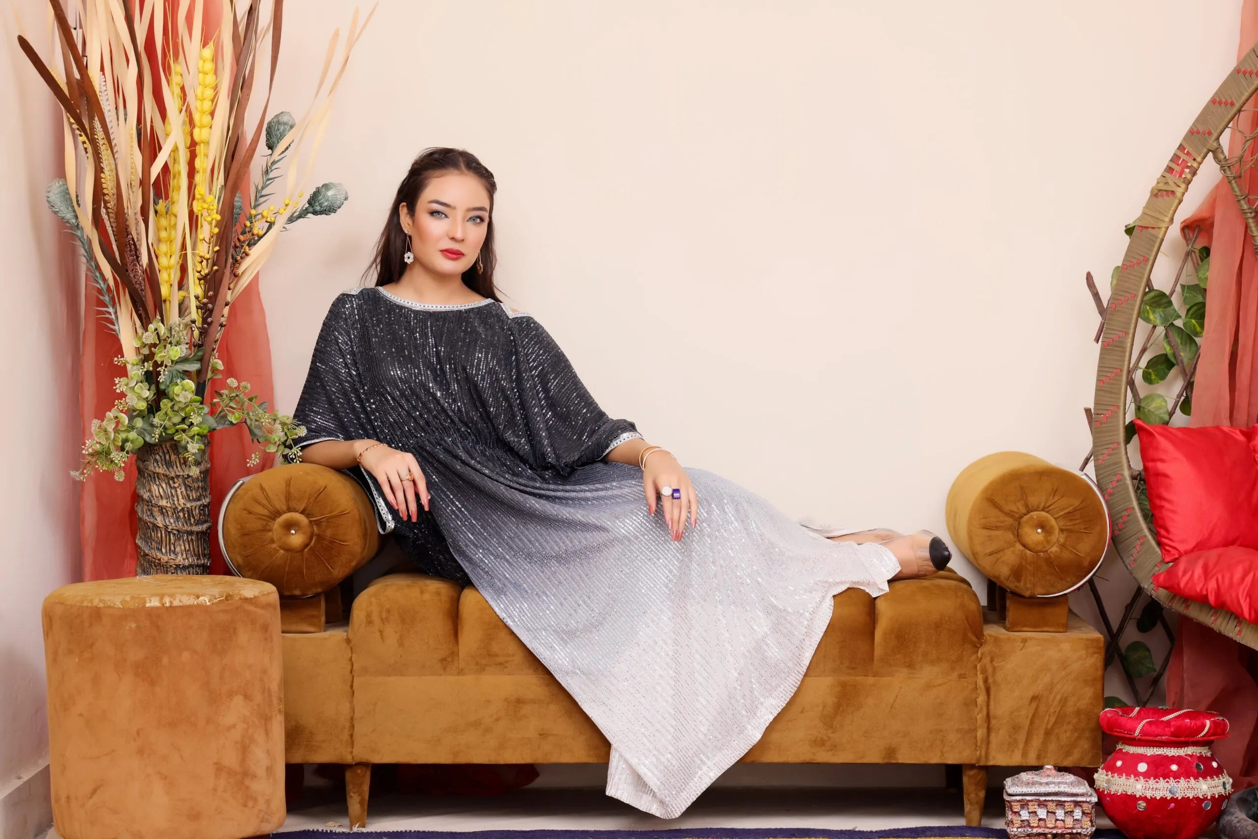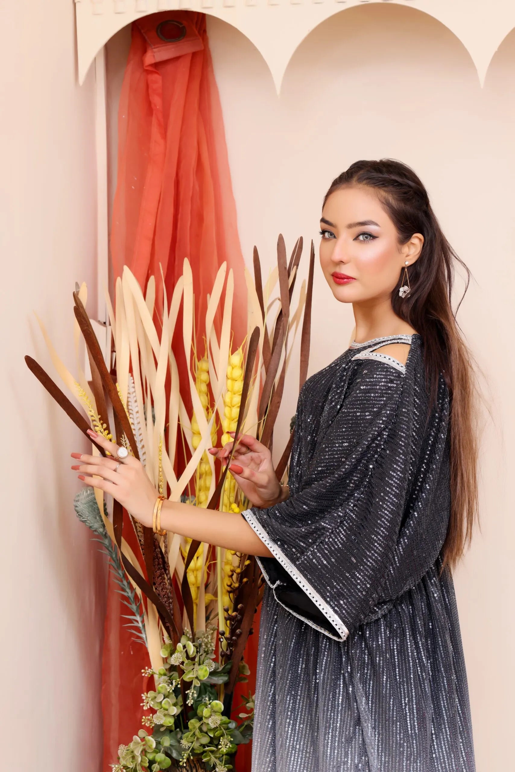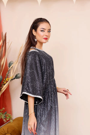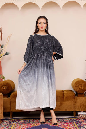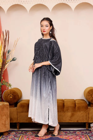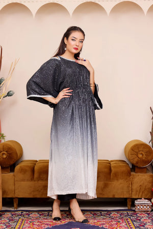 A black and cream double-shade sequin kaftan with silk lining is a statement piece featuring a seamless gradient effect, blending rich black into soft cream for a striking contrast. The delicate sequin lace embellishments enhance its opulence. Designed with a flowing, elegant silhouette, the kaftan drapes effortlessly, exuding grace and sophistication.