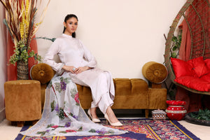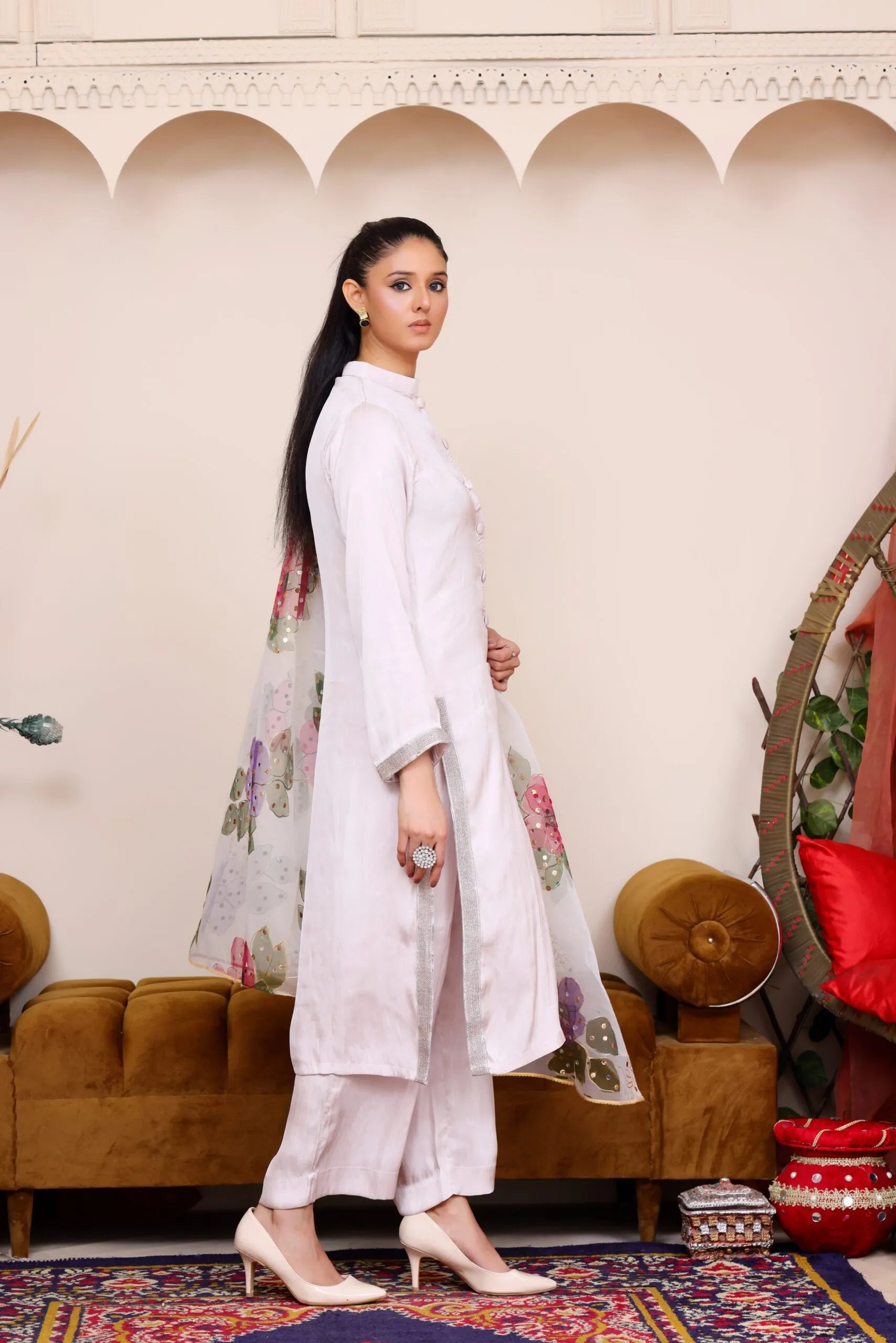 Trouser: The outfit is paired with a cotton silk trouser, providing a smooth, fluid drape that perfectly complements the shirt. The soft fabric ensures a sleek and graceful silhouette, adding to the outfit’s refined appeal.