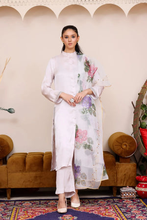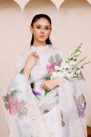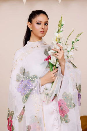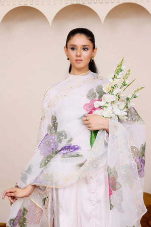 Dupatta: The organza hand-printed dupatta brings a touch of art to this ensemble. Adorned with dori work and mirror pasting, the dupatta reflects light beautifully, adding a delicate, traditional touch. The hand-painted design enhances the entire outfit, making it a unique and eye-catching statement piece.