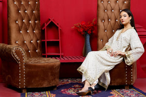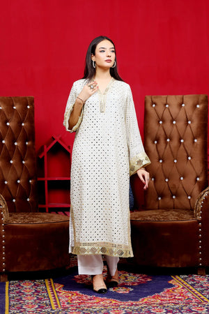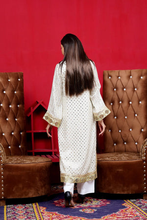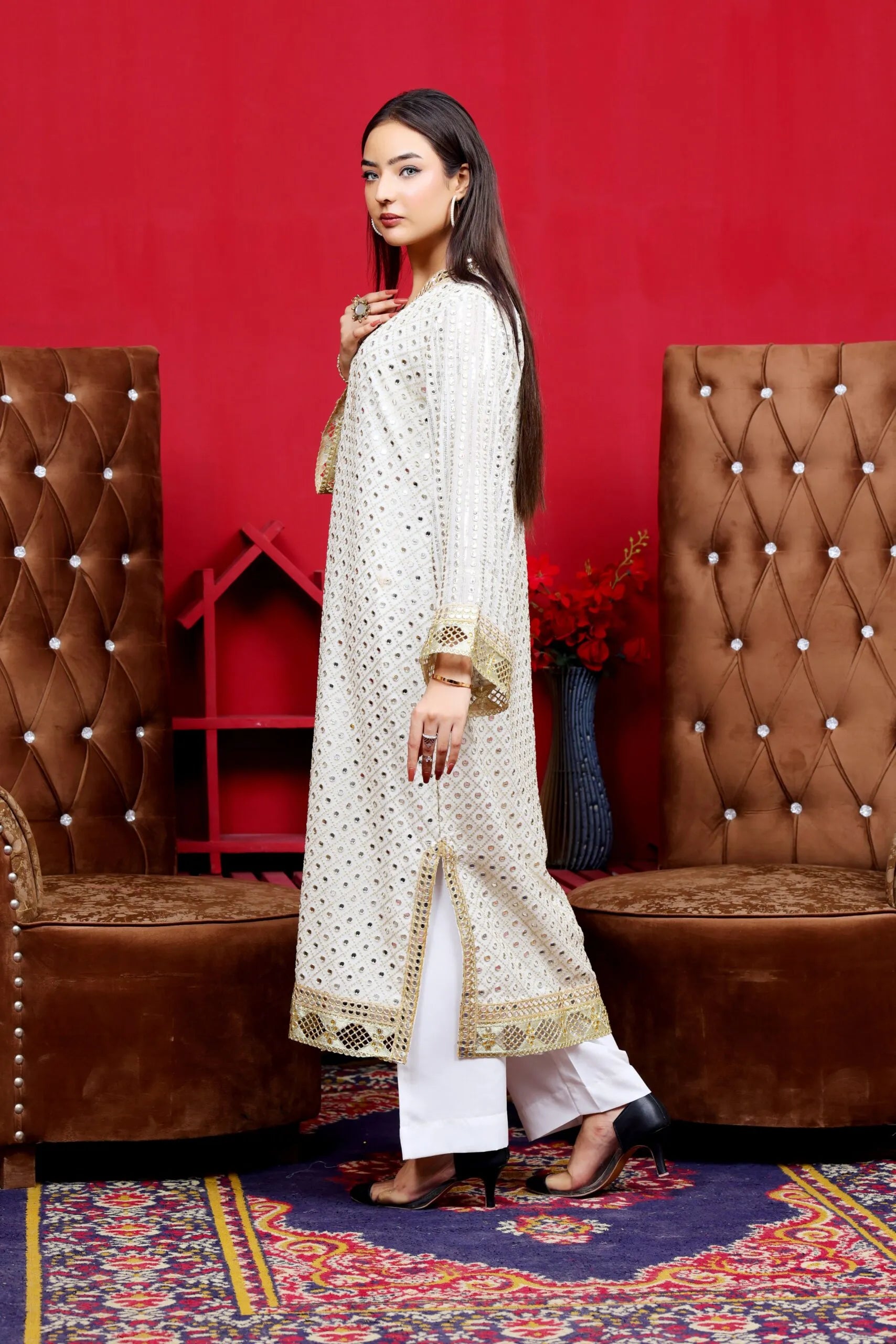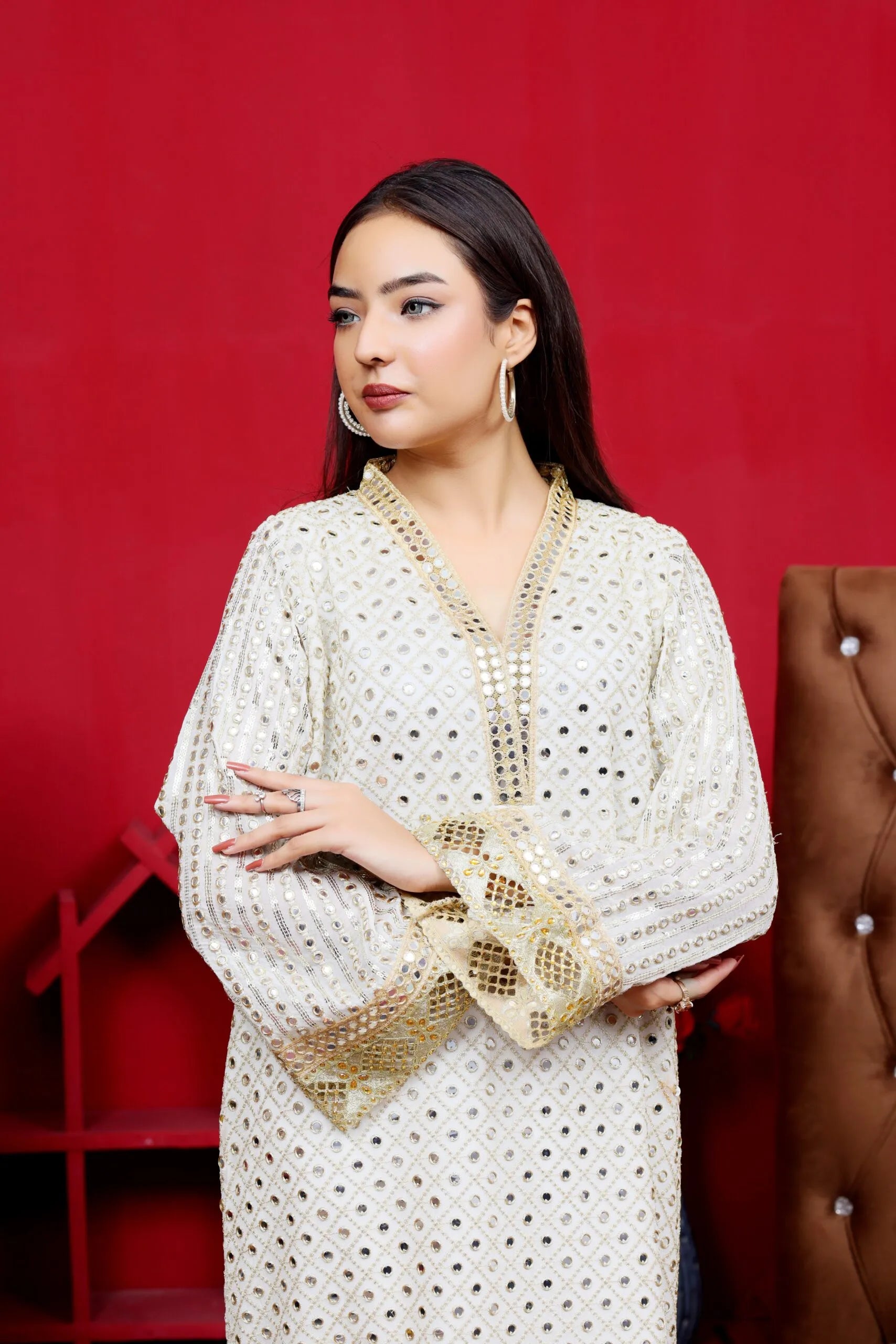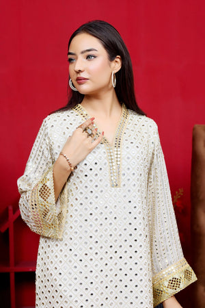 Ivory Pakistani 2-Piece Outfit with Mirror & Zari Work – this elegant long shirt with malai trousers blends tradition and comfort for any festive occasion.