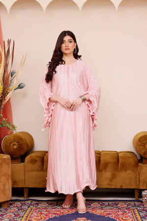 The Zainab Pink Kaftan Dress is an elegant 2-piece outfit crafted from lightweight fabric with fine pleats and a relaxed silhouette perfect for modest fashion lovers